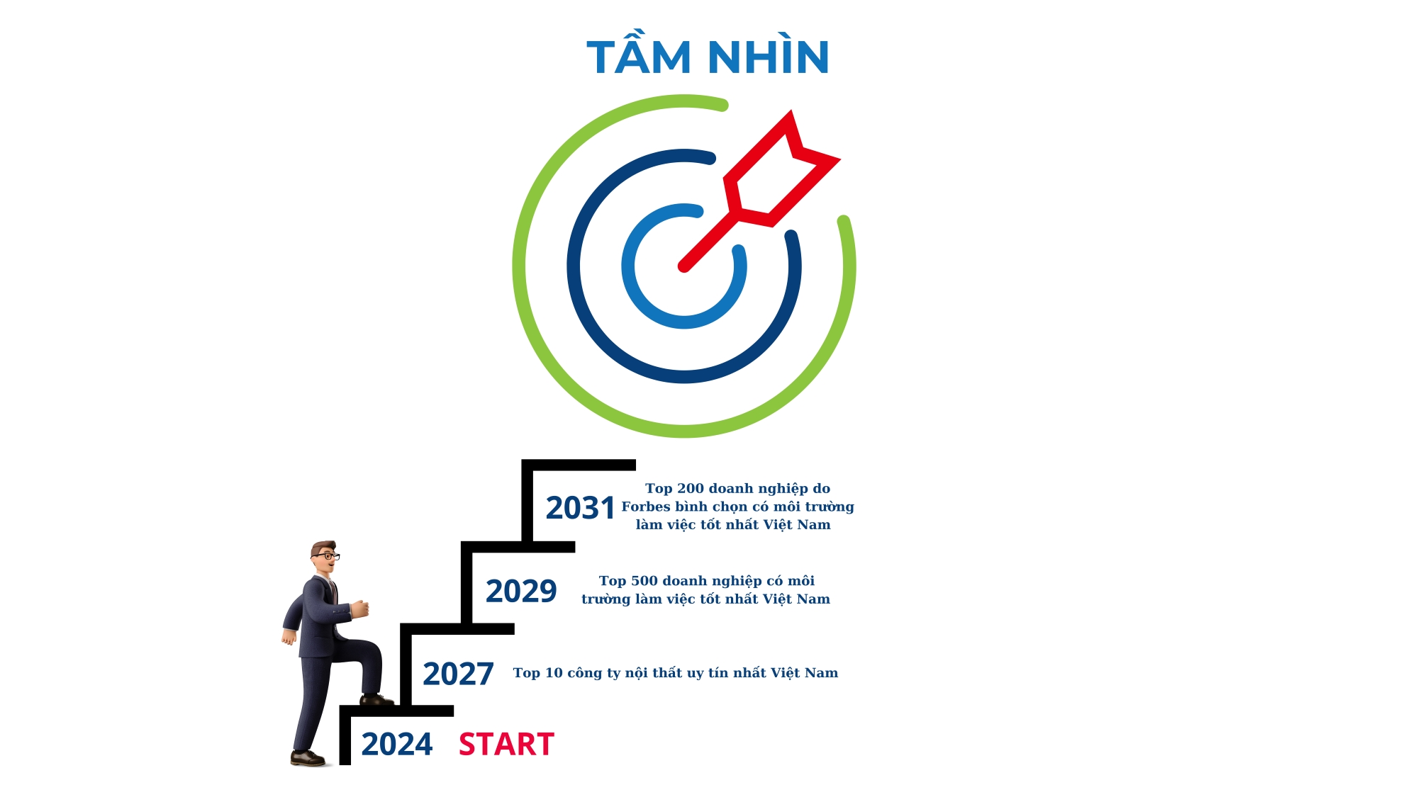 Trở thành một công ty thiết kế và thi công lớn mạnh, hoạt động có hiệu quả, phát triển bền vững, có trách nhiệm, kiến tạo những khoảng không gian hợp lý và chất lượng cho khách hàng. 2030 trở thành top 200 doanh nghiệp do Forbes bình chọn có môi trường làm việc tốt nhất Việt Nam.